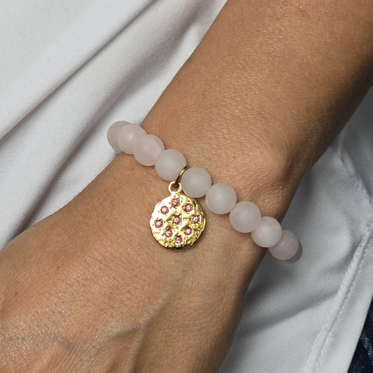 Bracelet ISIS en quartz rose – Médaillon martelé et strass rose