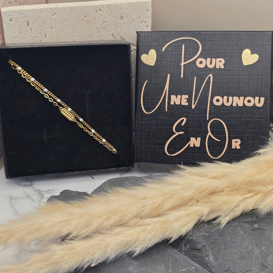 Tu veux marquer le coup avec un cadeau qui sort du lot ? Pour 5 €, ajoute un message personnalisé sur un joli écrin qui accompagne le bijou de ton choix. Un “Joyeux anniversaire”, un “Merci Maîtresse”, un “Nounou en or” ou carrément une phrase rien qu’à toi : c’est toi qui choisis !